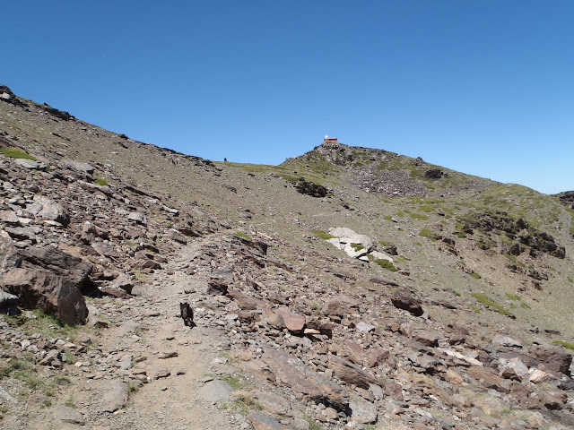 A partir de ahora, tomamos un muy marcado sendero que en suave pendiente se dirije hacia el Mojón del Trigo. Nos desviamos a la derecha sin subir finalmente a esta edificación por un sendero que en constante cota y bordeando el valle, nos lleva finalmente hasta el punto en la que está la valla que corta la carretera que sube al Veleta, accediendo así a la Hoya de la Mora y a las inmediaciones del Albergue Universitario, haciendo una parada de avituallamiento a la sombra del mismo.