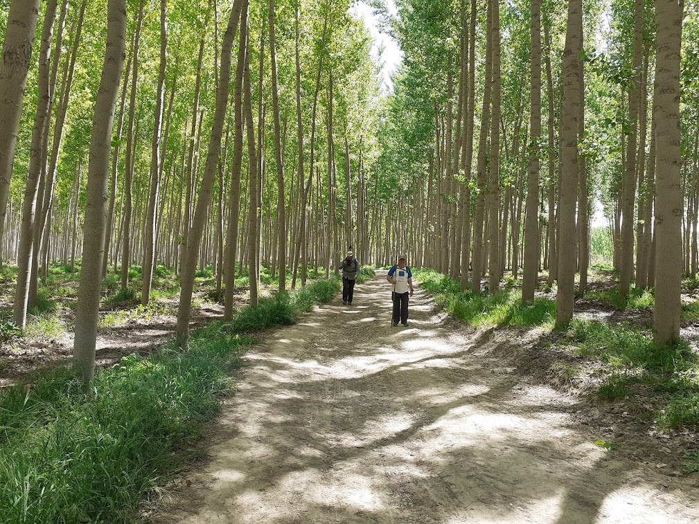 Caminamos por la cuerda de la izquierda, teniendo como referencia la dirección de las aguas del Cacín, justo en el borde del valle que mira hacia la vega por el que transcurre mansamente el río, oculto en una inmensa chopera verde en la que se nos pierde la vista hacia el Sur, dirección a la que poco a poco nos dirigimos, sin prisa y sin pausa, disfrutando de cada pisada.