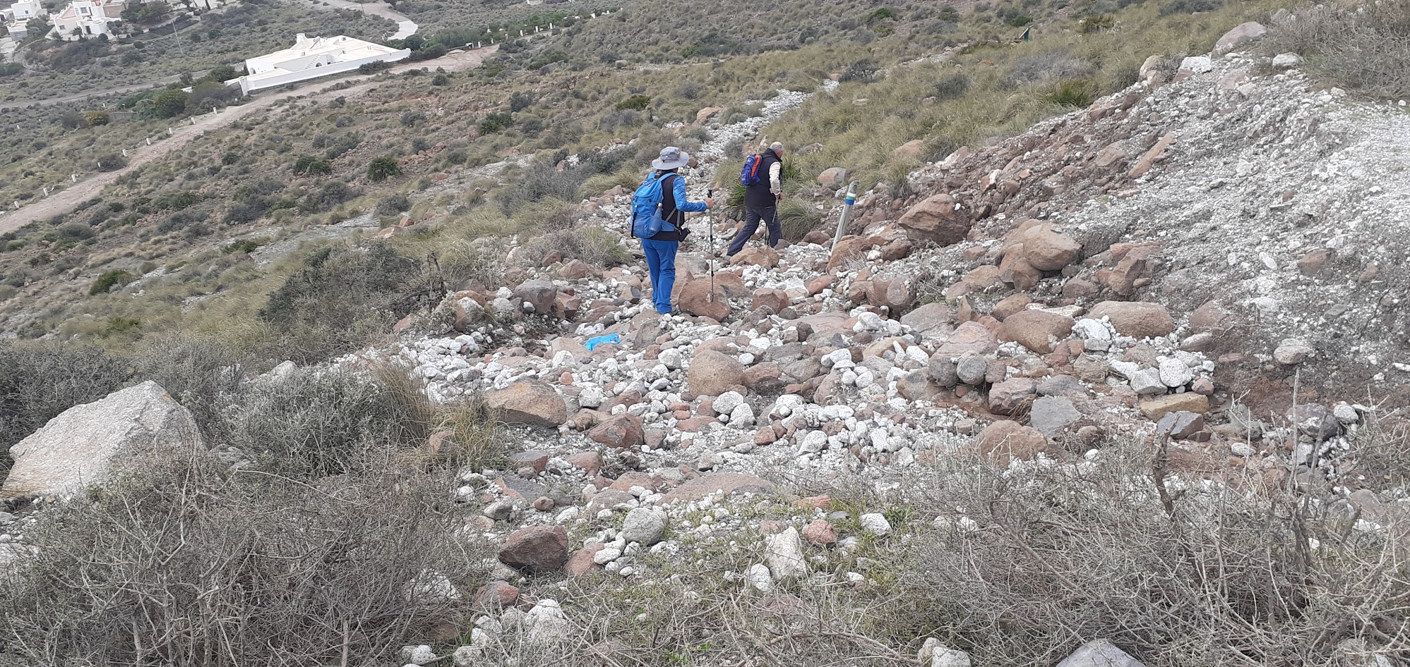 El serpenteante carril ascendente está descarnado, con gruesas piedras en el suelo, grandes socavones, y lo peor, las bestiales rachas de viento, hacen duro el caminar y en ocasiones amenazan con echarnos a tierra. Con gran esfuerzo, vamos atravesando el Collado de los Grajos y la Casa del Tomate hasta encontrarnos con una zona de grandes desprendimientos en las inmediaciones de la Torre de Cala Higuera.