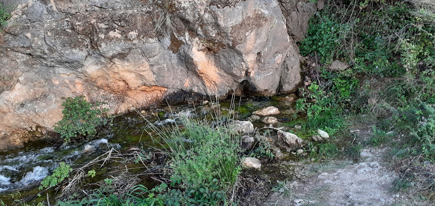Toca ahora acercarnos tranquilamente hacia los cortados farallones de la Sierra de San Jorge, en los que brota abundante el agua que va conformando, saliendo de multitud de rendijas de la roca, el caudal maravilloso que dará origen a este hermoso paraje y sitio singular que es la Fuente de los 100 Caños.