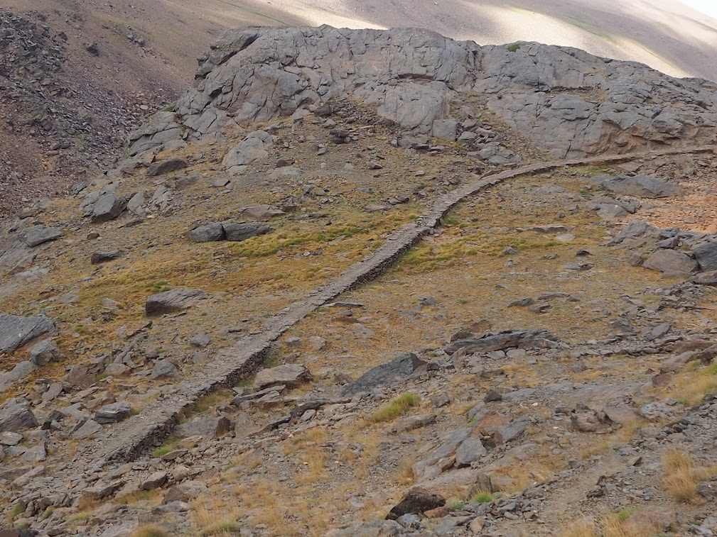 Sin prisa y sin pausa, vamos pasando barrancos hasta llegar a las ruinas del Refugio de Lanjarón (2.824 msnm), superamos la Loma del Caballo (2.645 msnm) y hacemos breves paradas para repostar y celebrar en repetidas ocasiones "el ritual del agua", sobre todo en el chorrillo que pasa por el Barranco del Hinestral (2.393 msnm).